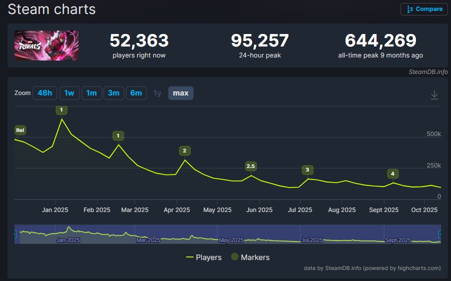 Why it matters: While Marvel Rivals still holds more players on Steam than multiple live-service titles combined, the continuous sharp decline suggests that it’s headed towards a shorter lifespan than its initial popularity suggested.