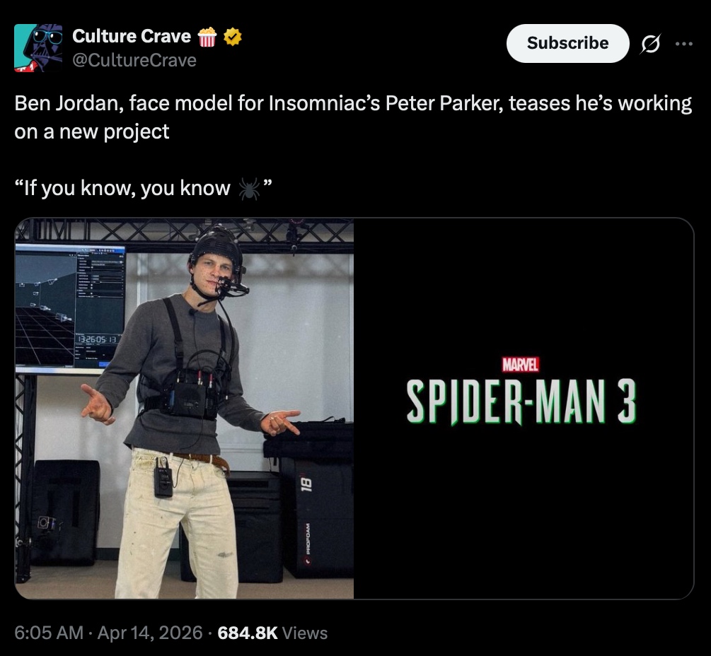 - Peter Parker face model posted an image in a mocap suit, with the caption “IYKYK”.