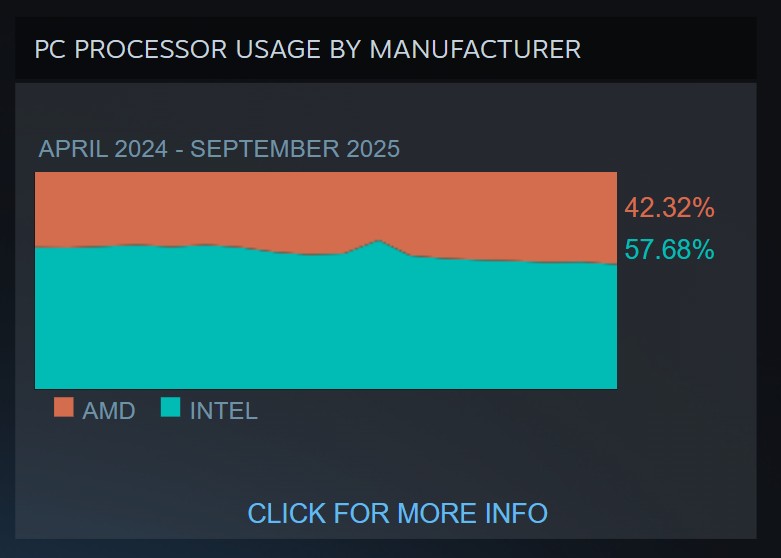Moreover, AMD now holds a significant processor share as well. While Intel remains in the lead, Team Red now holds over 40% of the Steam user base’s share, the highest it has ever been, hinting at potential problems for Intel.