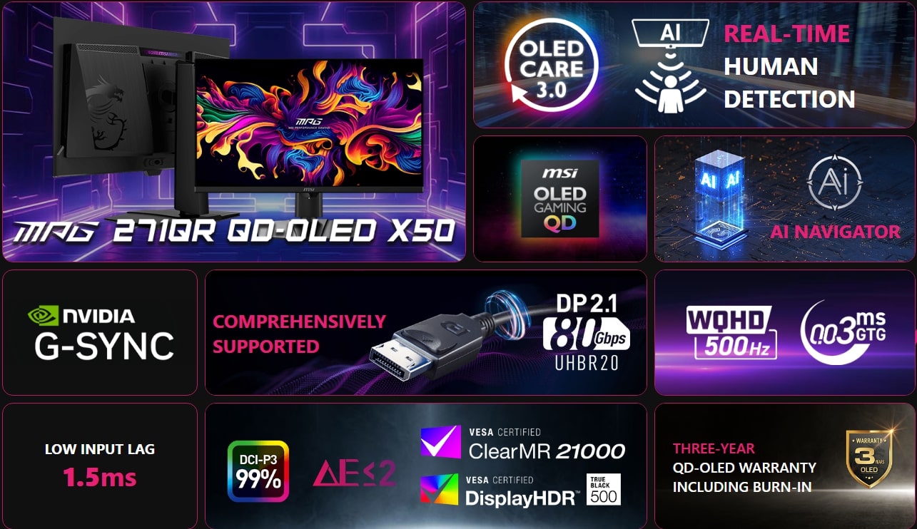 [Press Release] MSI has revealed its latest QD-OLED gaming monitors, led by the MPG 271QR QD-OLED X50 — the world’s first 27-inch 2K QD-OLED display with real-time human detection. Offering a 500Hz refresh rate and AI-powered optimization, it’s built to set a new standard for competitive gaming.