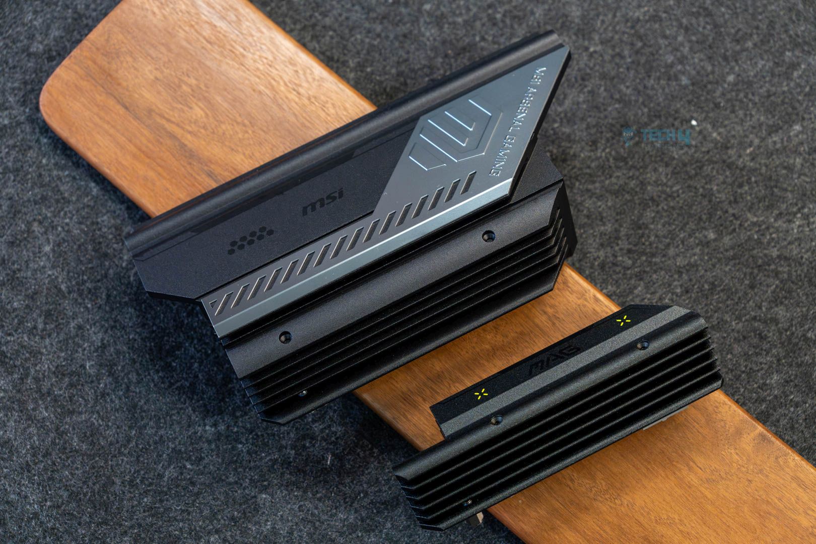 The VRM heatsinks don’t have a flashy design, but they look elegant with their matte-black and gunmetal-grey finishes. On the other hand, we see a similar stacked-fin design with 6 fins. The heatsink has 7W/mK thermal pads, so temperature shouldn’t be a problem.