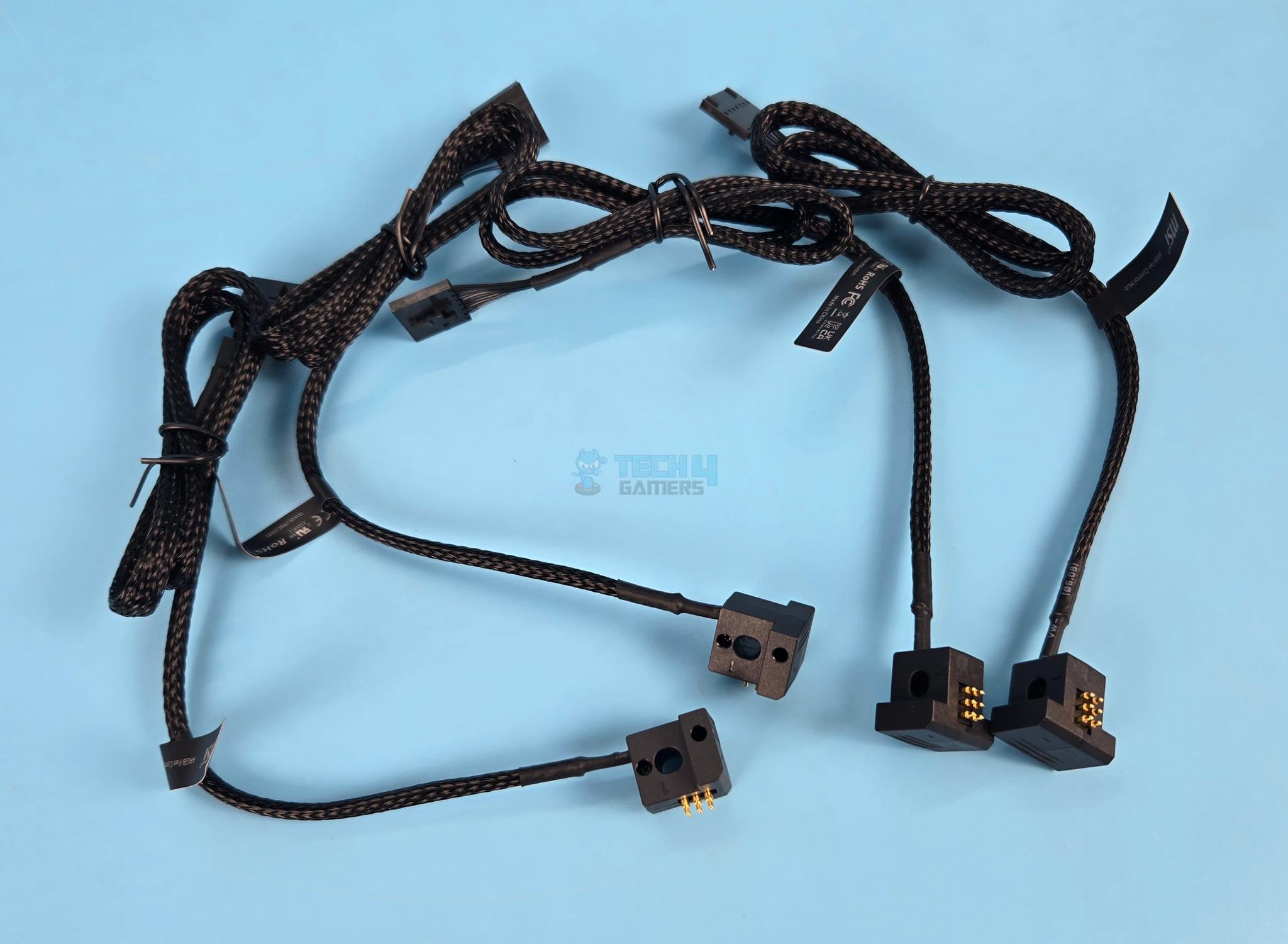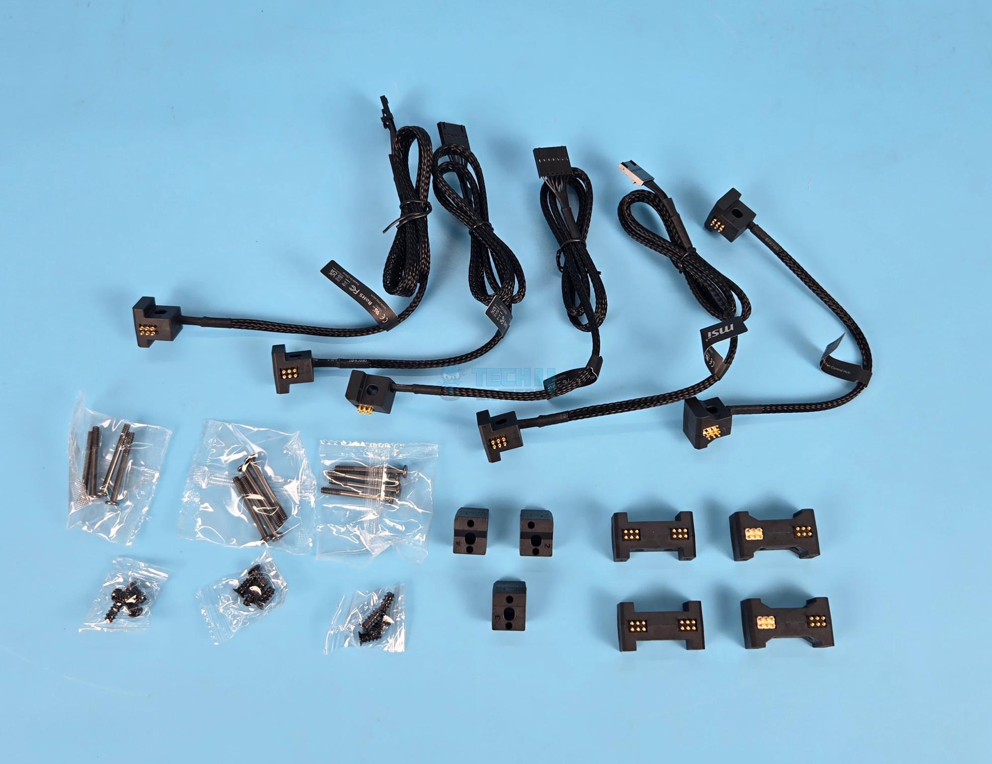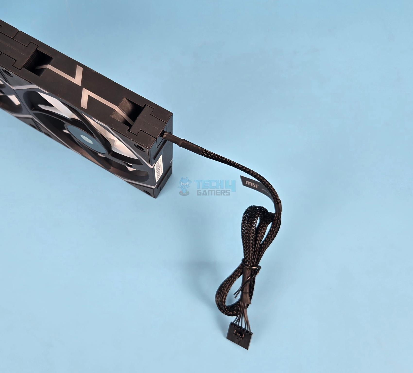 MSI has provided 4x Fan-to-Hub cables and 1x Daisy-Chain cable. Each fan-to-hub cable has a 7-pin connector that is connected to the hub and a 6-pin connector on the other end, which is connected to a mounting corner of the fan.