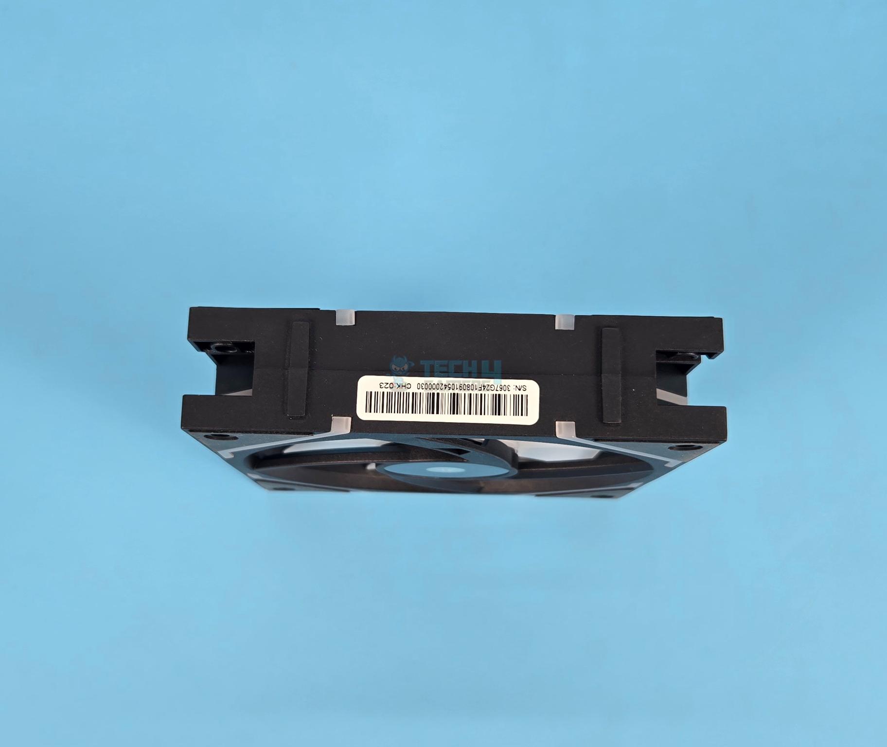 These fans have the same diffuser lines on the borders. Mounting corners feature anti-vibration pads. The backside of the frame has an angular 4-armed set providing a focused flow. No cable can be seen since this is a cable-free design.