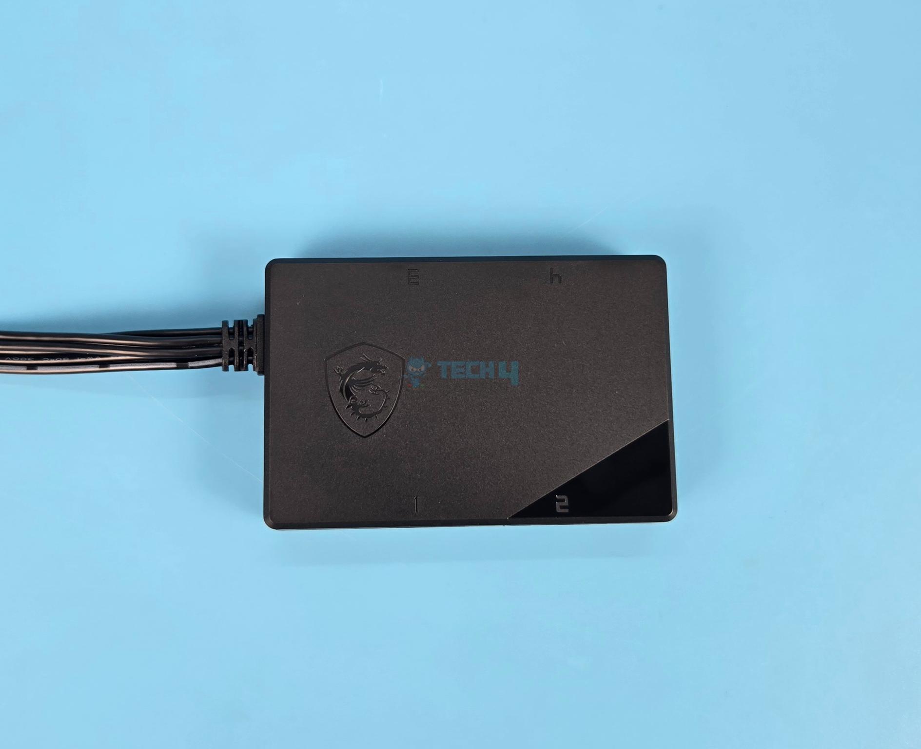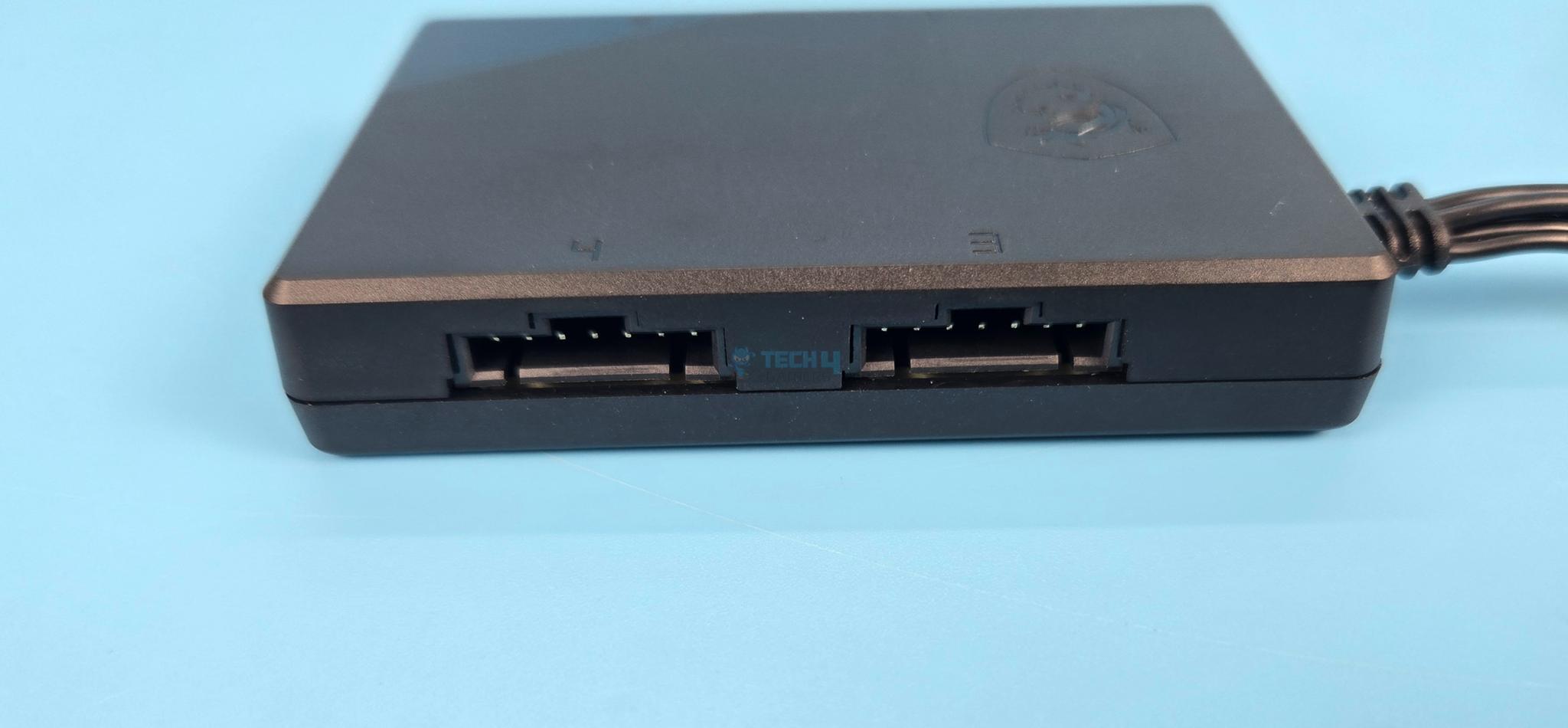 The hub is made of plastic material and has MSI branding over the top. It has a total of 4x ports labeled from 1 to 4. It is important to pay attention to this numbering. You must start from number 1 port. Each port can support up to 6x EZ120/R fans. However, total fans support per hub is 18. Keep that in mind. Each port has 7-pins.