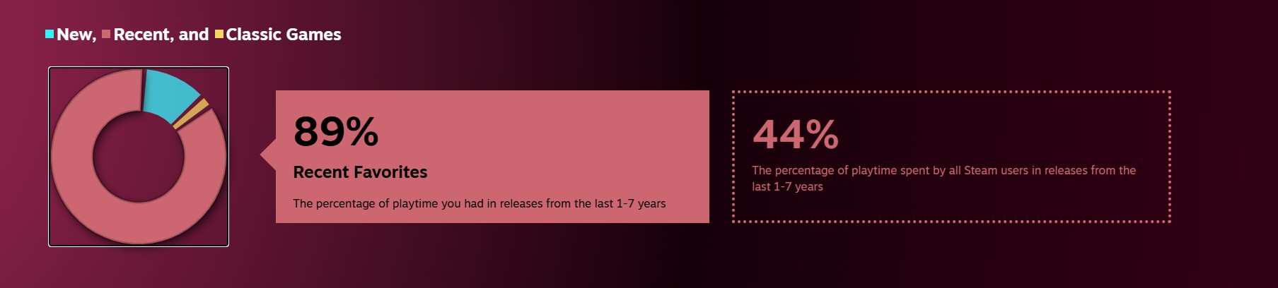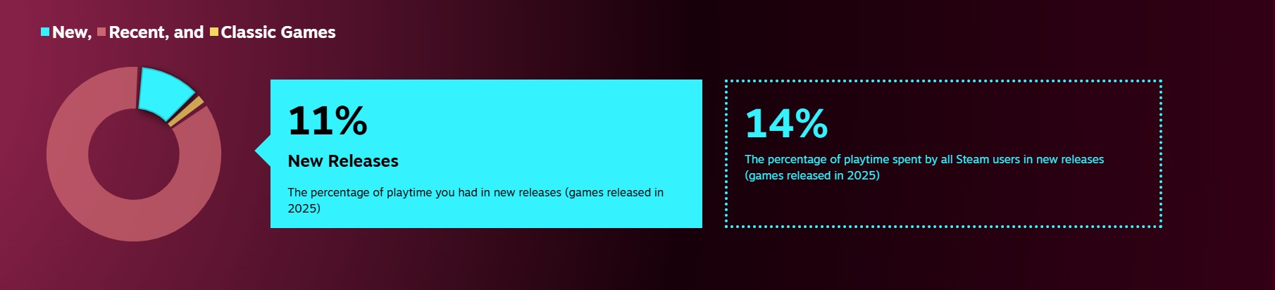 As every year, Steam published its new Replay report that is personalized for every user. It shows that all Steam users averaged only 14% of the total playtime on titles that launched this year, with the rest taken up by games that came out in 2024 and before.