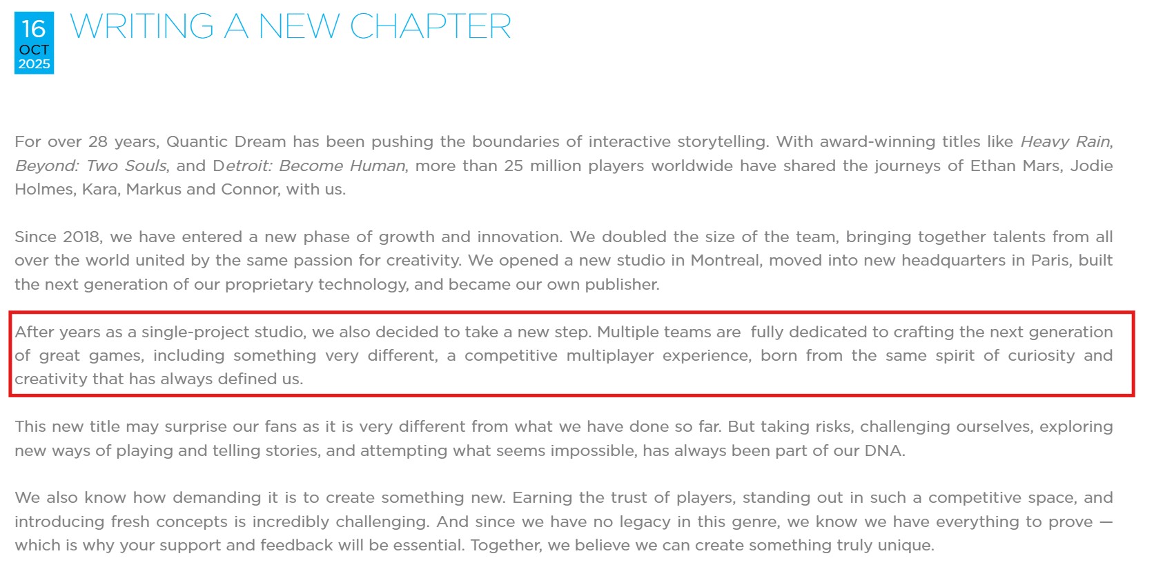 - Quantic Dream has revealed it is working on a brand new competitive multiplayer game.