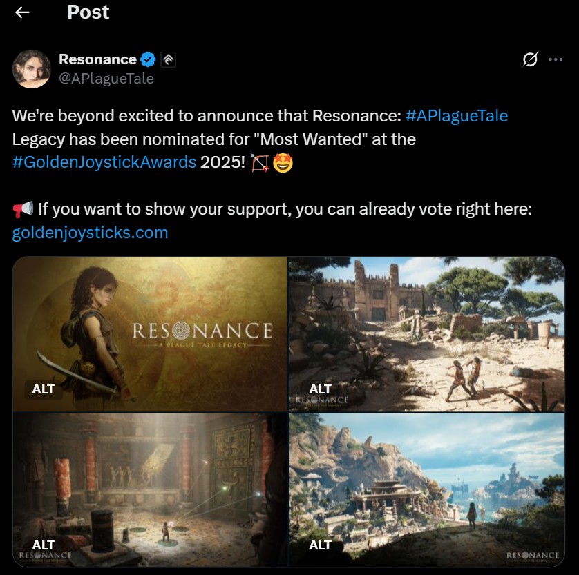Asobo Studio last year revealed Resonance: A Plague Tale Legacy, which serves more as a spin-off than a sequel. Nonetheless, the title has now been nominated for the ‘Most Wanted’ award at the Golden Joystick Awards 2025.