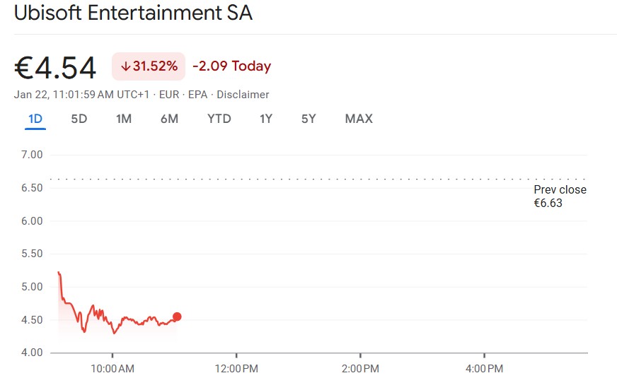 The shares dropped by over 31%, leading to losses on the SBF 120 index. If these losses hold, Ubisoft is on a grim path to suffer the largest single-day drop since it went public back in 1996. At the time of writing, the shares are being traded at 4.54 euros.