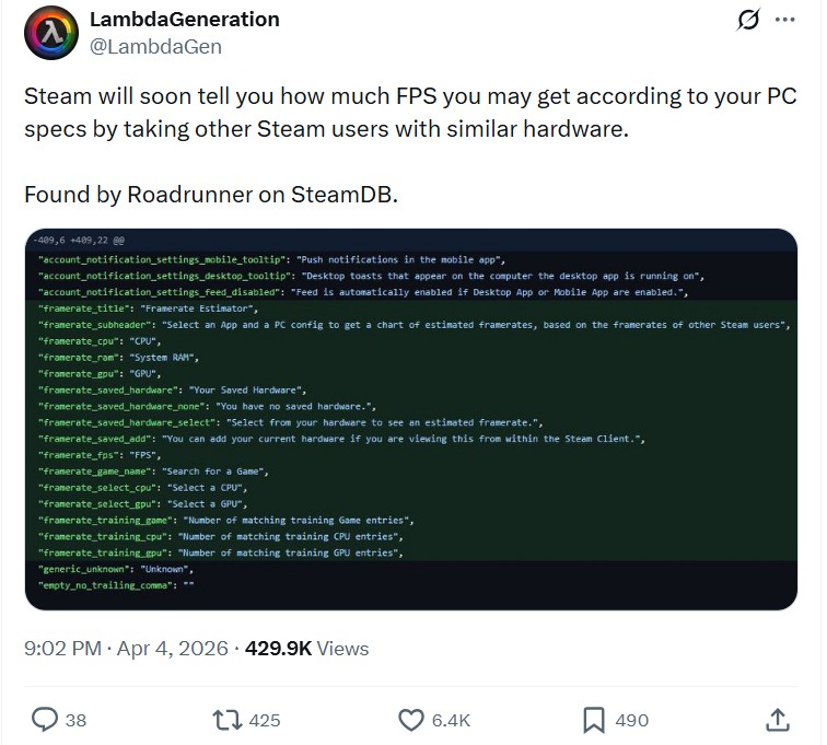 - Valve is working on a framerate estimation tool for Steam to make performance transparent.