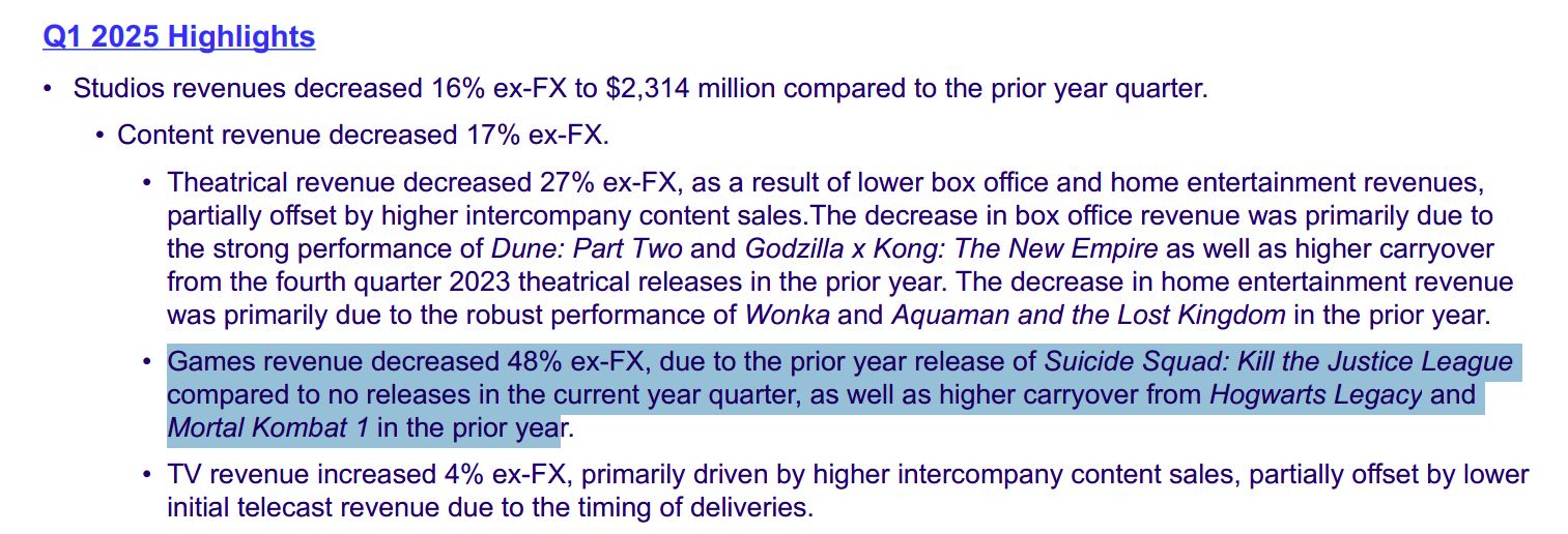 - Warner Bros Games suffered a 48% decline in revenue during the first quarter of 2025.