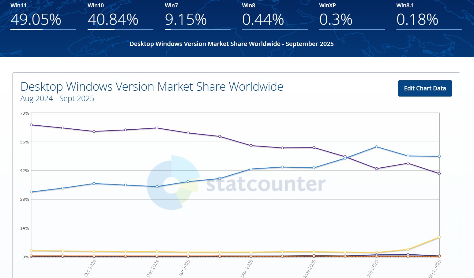 According to data from Statcounter, as of the end of September 2025, Windows 10 saw a drop of around 40% in market share, whereas Windows 7 saw an increase by 10%, its highest since Microsoft dropped its support.