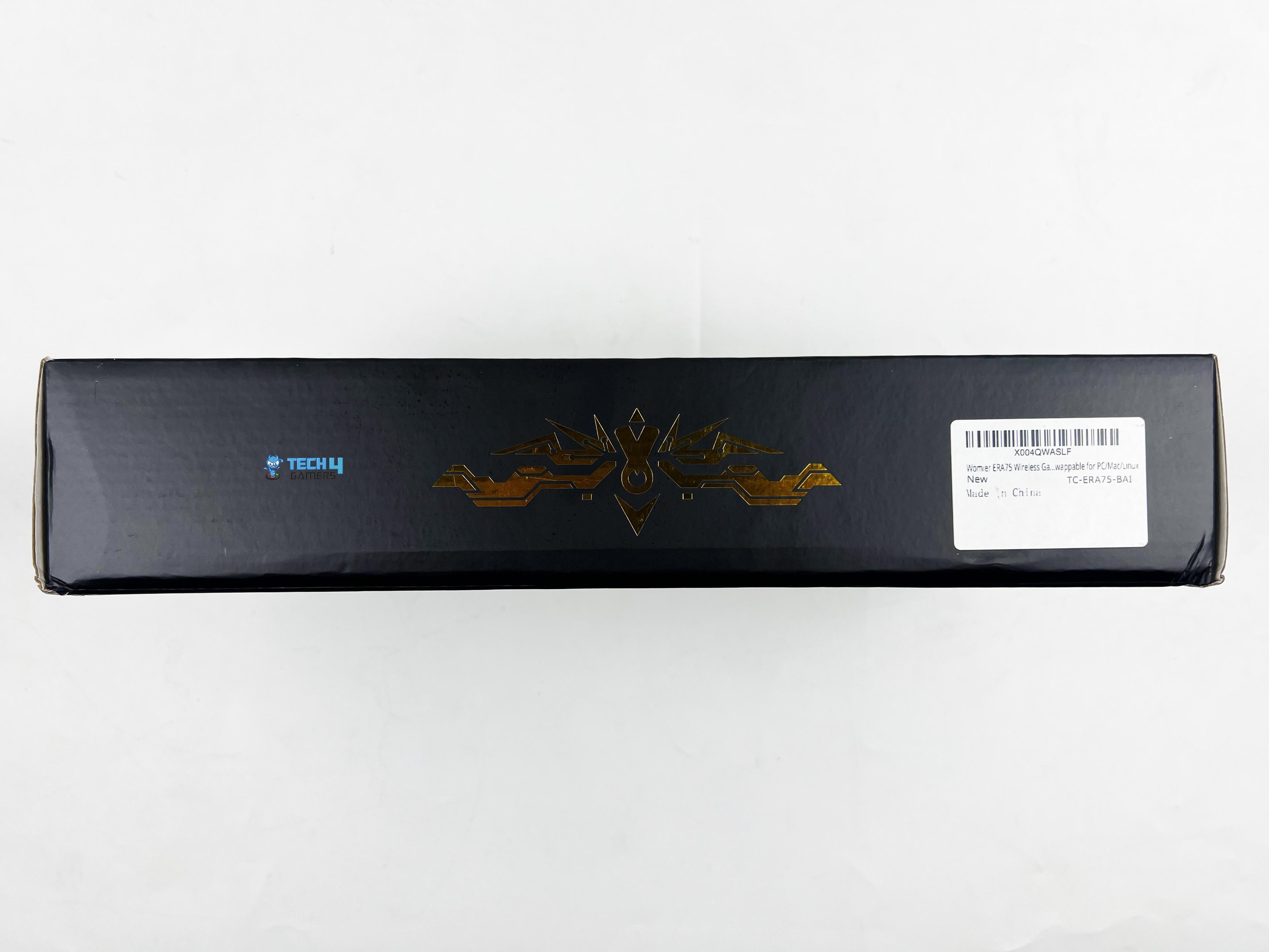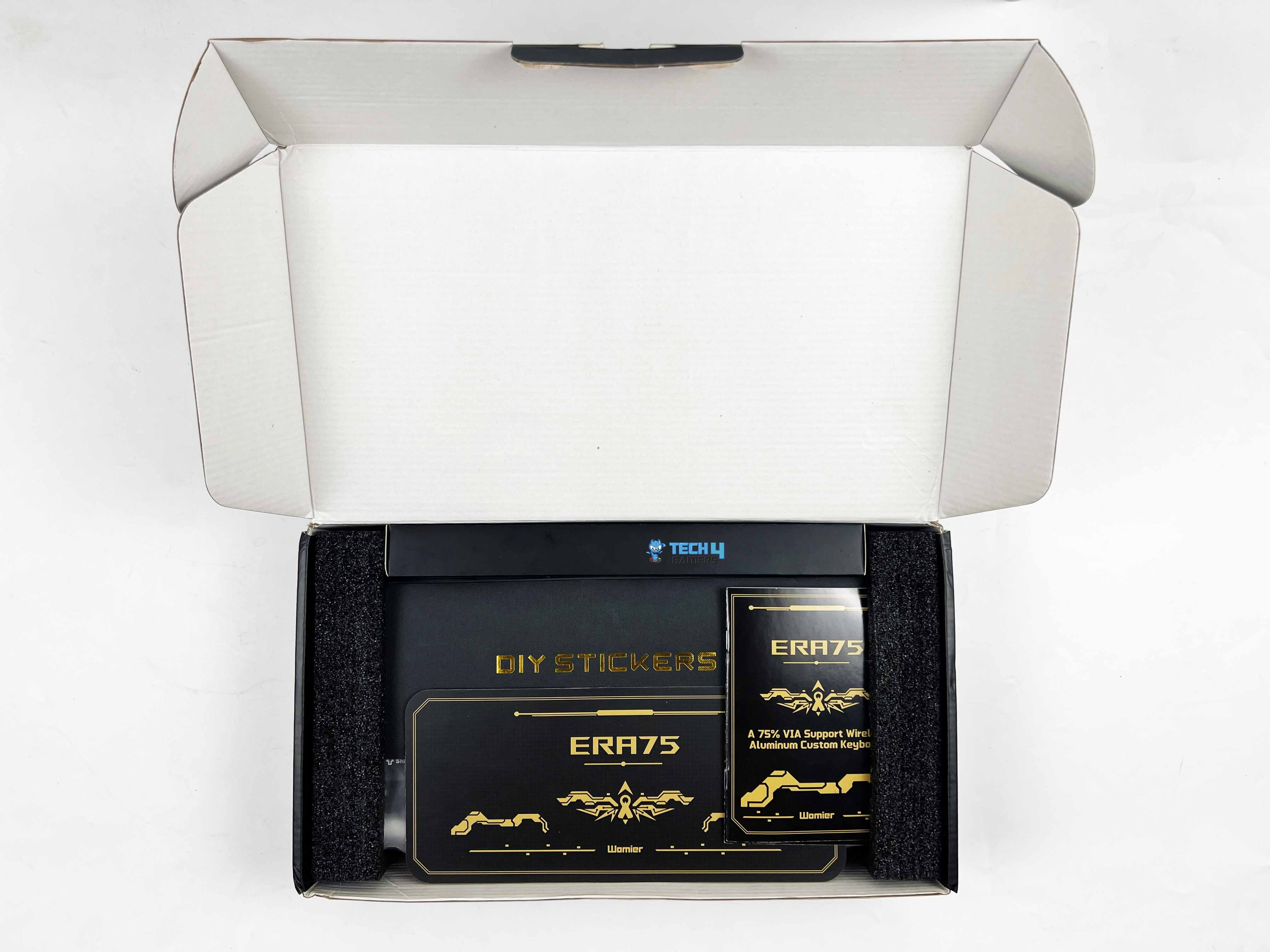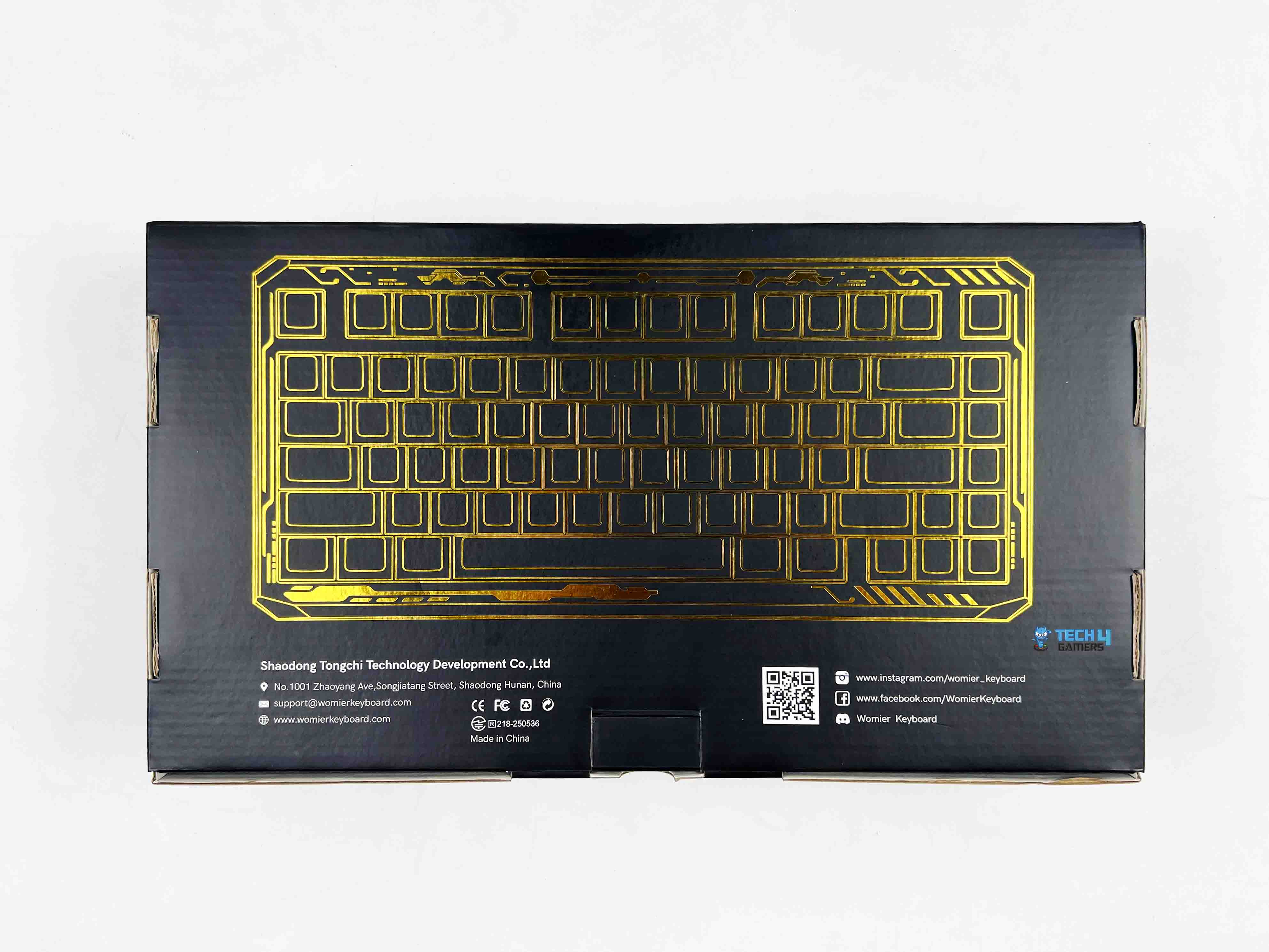 The Womier ERA75 comes in an all-black box accented with gold. On the front, we have the keyboard’s model name and Womier branding printed in shiny gold, along with a sticker-style design that you’ll later see in the box. The same gold sticker motifs can be seen along the sides. Flipping it over, the back features a gold outline of the keyboard itself along with the usual details about Womier’s social handles and the manufacturer’s information.