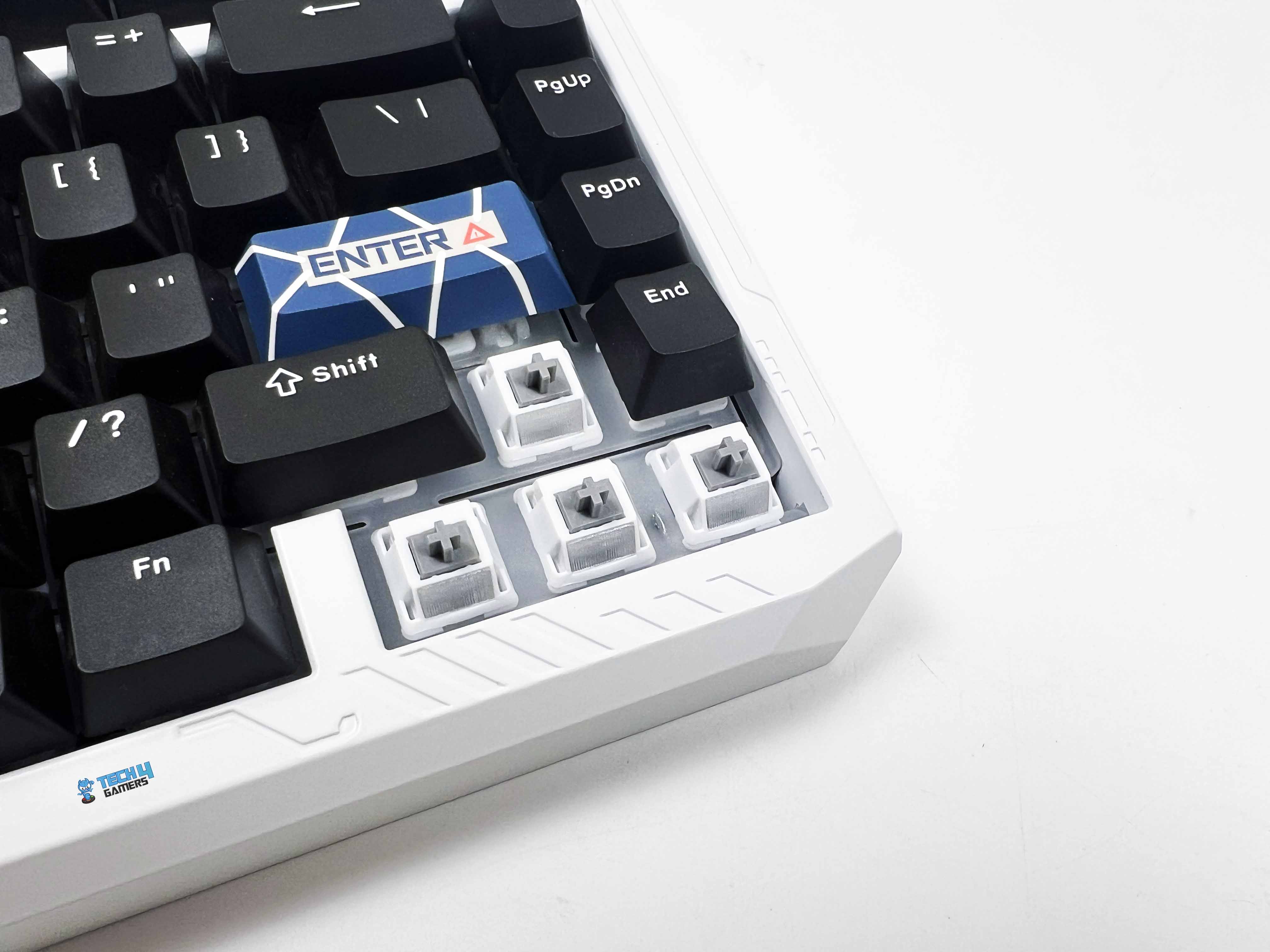 The Womier ERA75 uses Womier’s own POM Series switches, and the one I have in my Doomsday variant comes with POM ASH switches. Each keyboard color variant comes with its own matching switch color, which honestly shows how much attention to detail Womier has put into the board’s overall design and theme. These are linear switches with an actuation force of 50g, pre-travel of 1.8 ± 0.4 mm, and a total travel of 4 ± 0.2 mm.